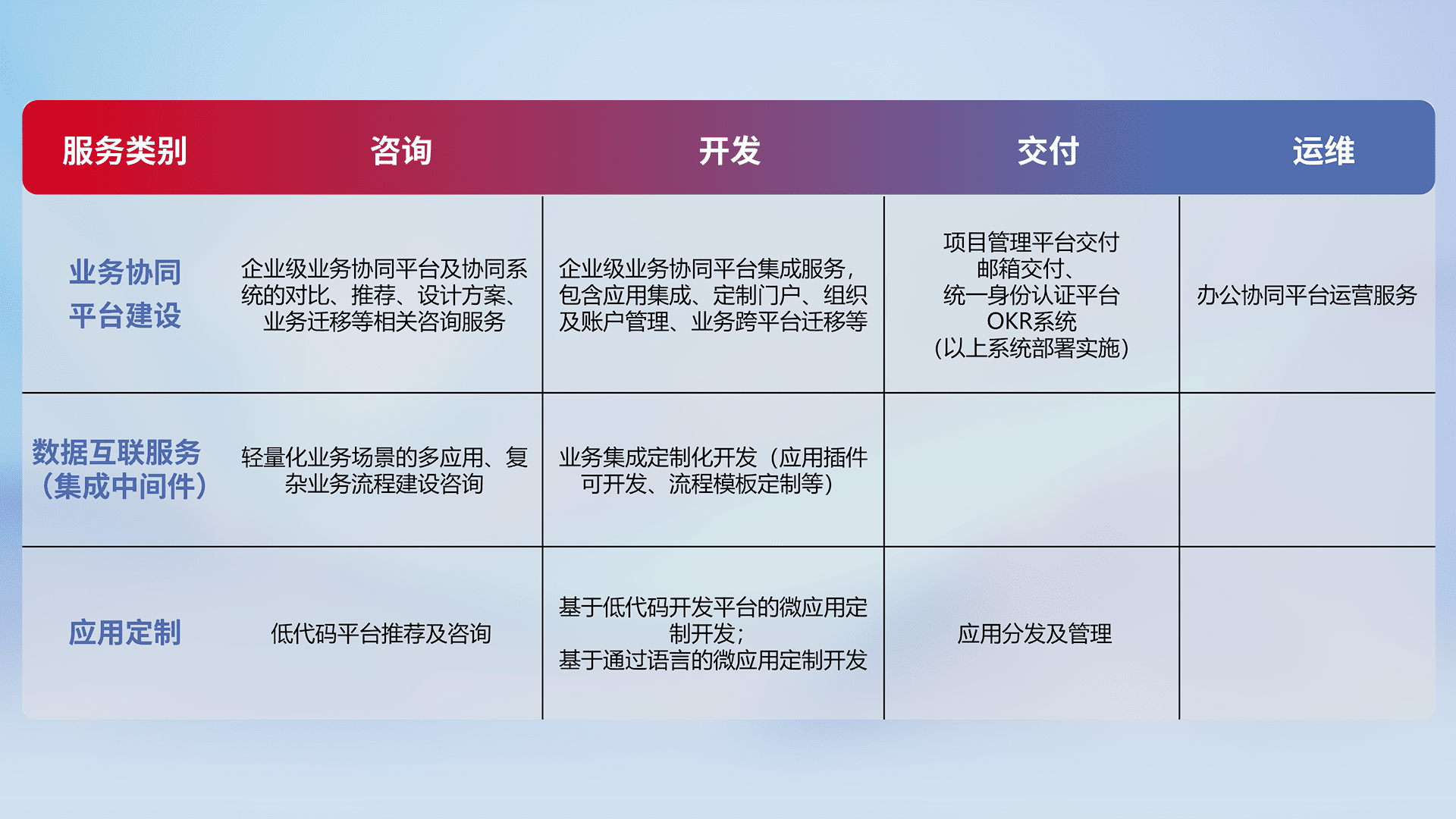 针对钉钉、、、企微、、IDaas等平台级产品提供产品的规划、、、、方案、、、、交付、、、、定制化开发等服务,,,,实现如统一协同办公、、、、智能客户服务、、混合会议管理、、智能数据查询、、、等业务场景,,,实现数字化转型。。